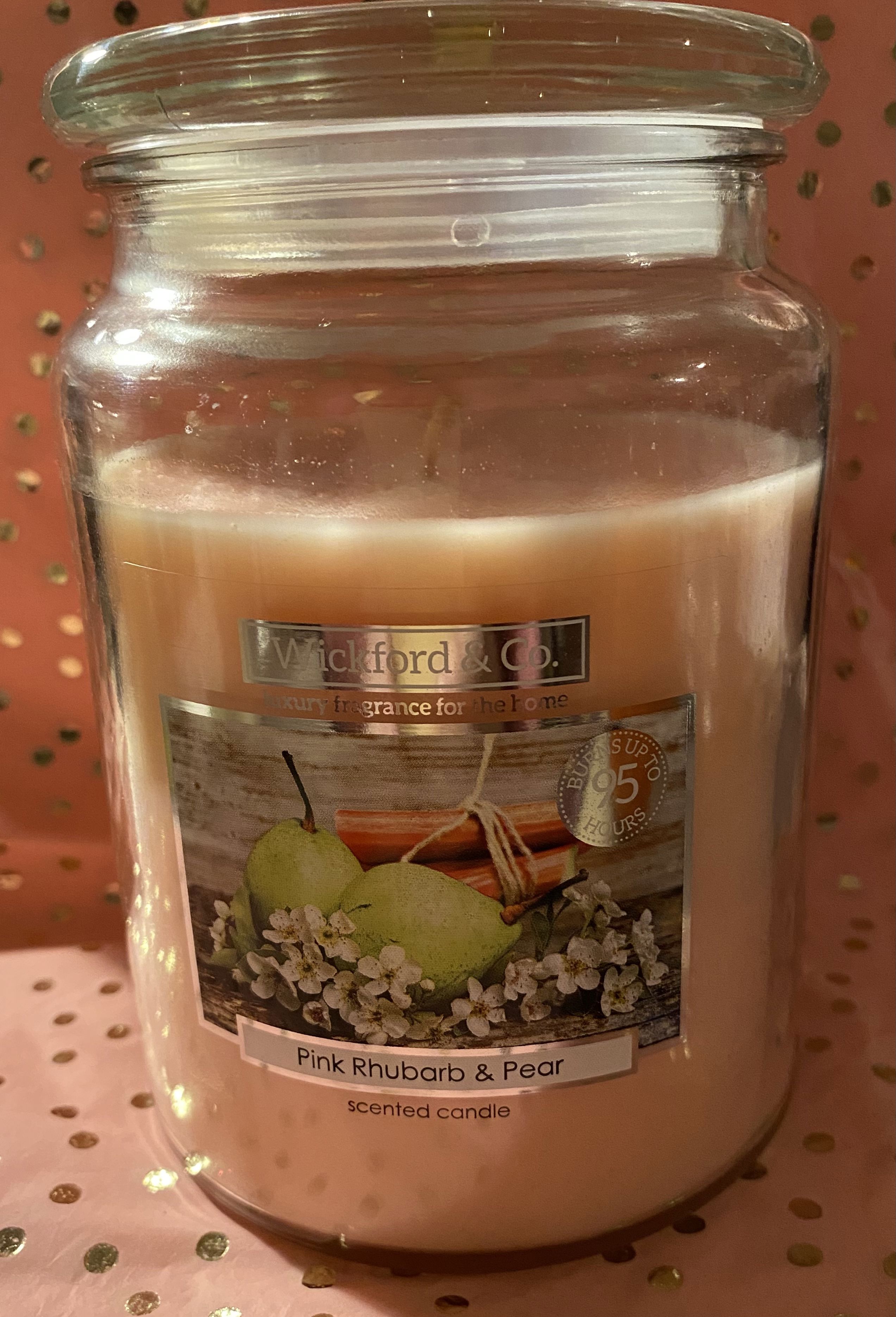 sweet, sweet, scent of spring. Pink rhubarb & pear scent is delightfully sweet perfect for large air cooled room setting.18oz candle with up to 95 hours burn DO NOT BURN FOR MOTE THAN 4 HOURS AT A TIME!